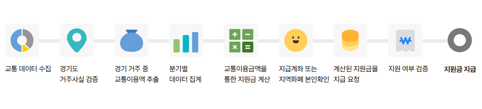 분기별 6만원 한도이며, 일 년에 24만 원까지 지원받을 수 있습니다. 수도권 대중교통을 이용하면 지원가능합니다. 대중교톻을 이용하고 이후 사용한 교통비를 지역 확 폐 또는 계좌로 다시 돌려받는 사업입니다.